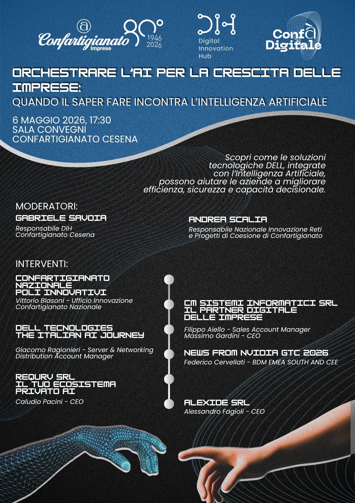 Il programma prevede gli interventi di Vittorio Blasoni, dell’Ufficio Innovazione di Confartigianato nazionale, sul tema delle politiche innovative; Giacomo Ragionieri, Server & Networking Distribution Account Manager di Dell Technologies, con un focus su The Italian AI Journey; Claudio Pacini, CEO di Requpu Srl, che interverrà su Il tuo ecosistema privato AI; Filippo Aiello, Sales Account Manager, e Massimo Gardini, CEO di CM Sistemi Informatici Srl, sul ruolo del partner digitale delle imprese; Federico Cervellati, BDM EMEA South and CEE, con un intervento dedicato alle novità emerse da NVIDIA GTC 2026; Alessandro Fagioli, CEO di Alexide Srl.
